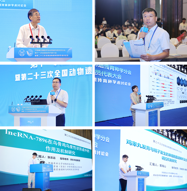 康相涛教授受邀在大会开幕式上致辞,李转见教授受邀主持家禽遗传育种分论坛报告。会上,田亚东教授作《地方鸡重要经济性状遗传基础解析与育种芯片开发》的大会特邀报告;李东华副教授、张志远博士研究生及郭海山硕士研究生分别在家禽遗传育种、功能基因组与生物技术分论坛作专题报告,分享科研成果。其中,李东华副教授的论文《多组学整合分析揭示淅川乌骨鸡乌度性状的分子机制》、郭海山硕士研究生的论文《单细胞转录组揭示鸡精子发生的动态路线图》荣获动物遗传育种“优秀论文奖”;祝廷奇博士研究生的论文《蛋白组学和蛋白磷酸化组学揭示禁食诱导鸡血睾屏障重构的机制》荣获动物遗传育种“优秀墙报奖”。