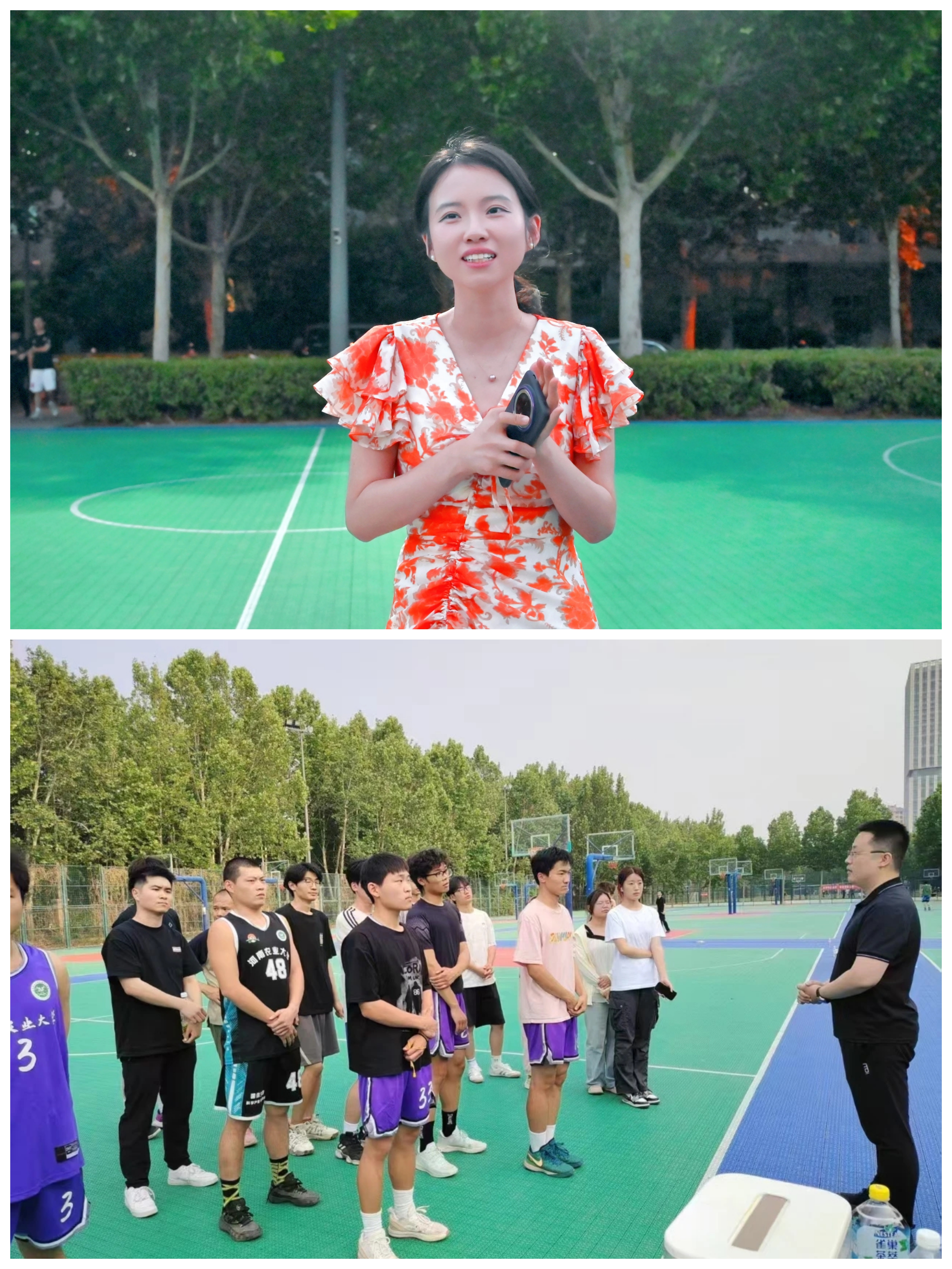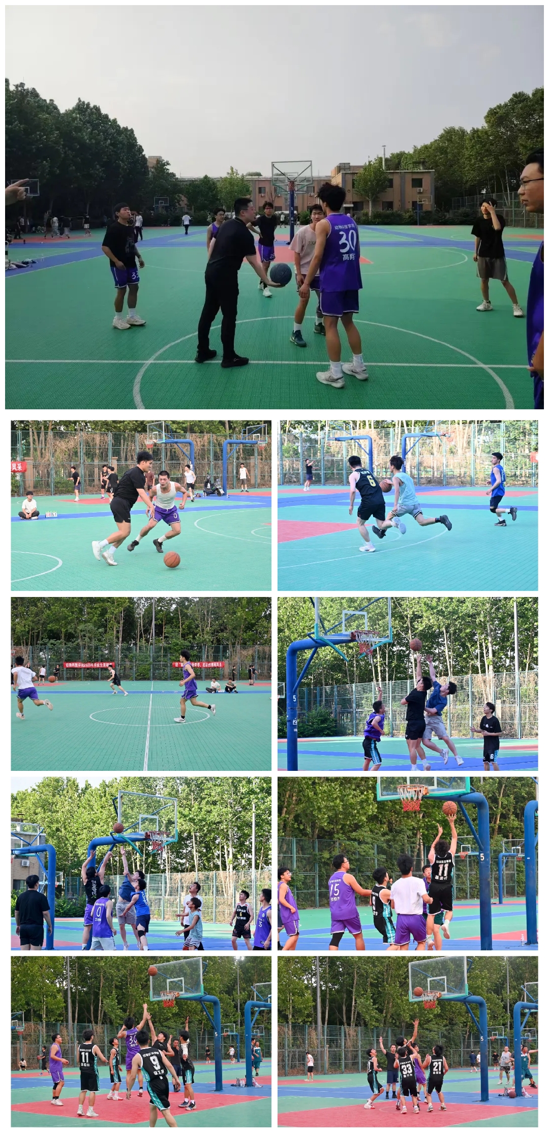 于龙子湖校区篮球场举办毕业生篮球赛,2025届本科生、硕士研究生毕业生踊跃参与,辅导员赵姝灿、郭明前往赛场为同学们加油鼓劲。