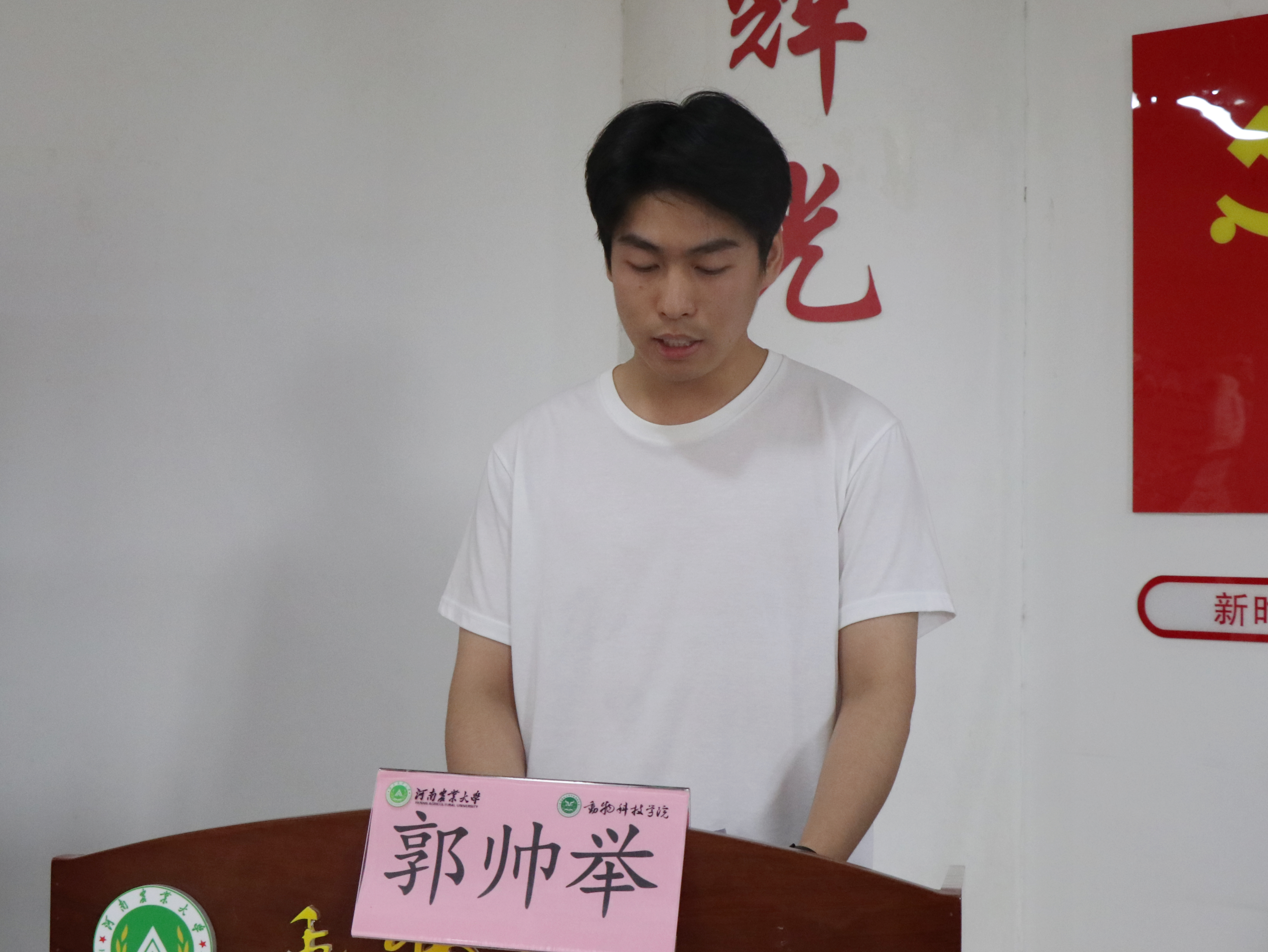 23级畜牧专业研究生郭帅举作为获奖学生代表发言,他对正大集团及学院老师的关心指导表示最诚挚的感谢。他回顾自身的学习经历,认为奖学金不仅是对过往努力的肯定,更是对未来的激励,将带着这份鼓励,以饱满的热情迎接新的挑战,回报社会,为国家发展做贡献。