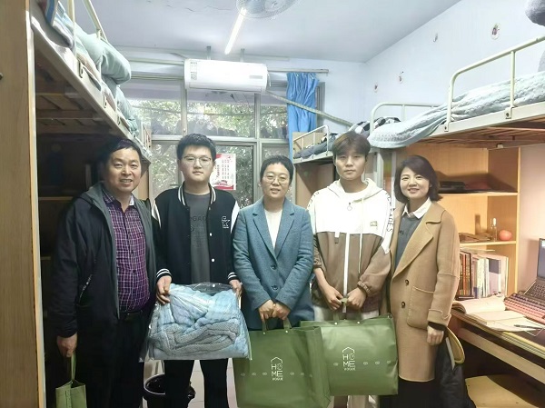 在桃李园学生公寓,院党委副书记郭娟等领导老师走进学生宿舍,将学院统一采购的毛毯等物资分批发放至有需要的学生手中,并嘱咐大家合理规划学业生活,自警自律,在大学的起步开头打好坚实基础。