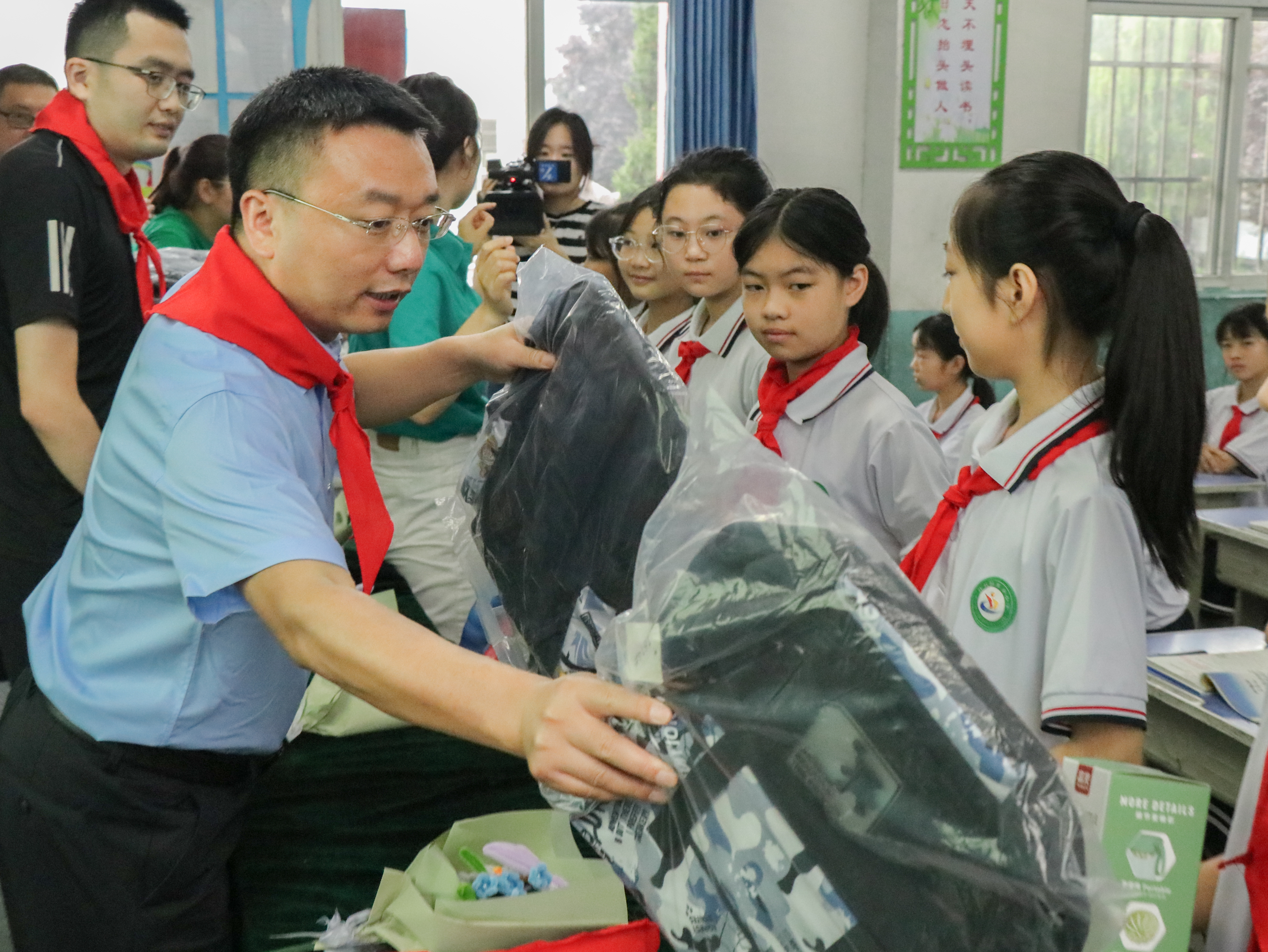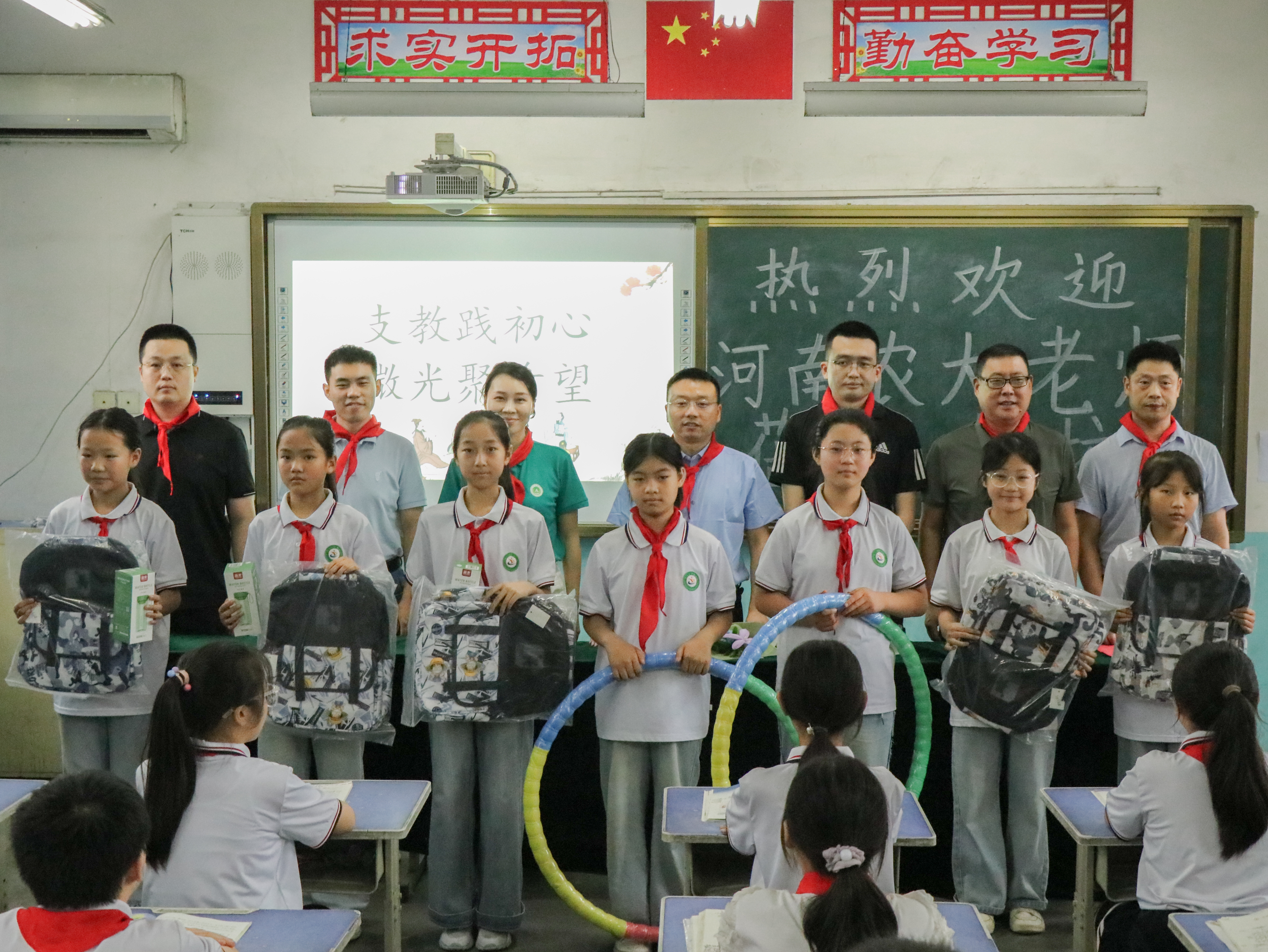 的领导老师除了进行互动交流,慰问支教成员,也为孩子们爱心捐赠了书包、水杯、呼啦圈等文体生活用品。