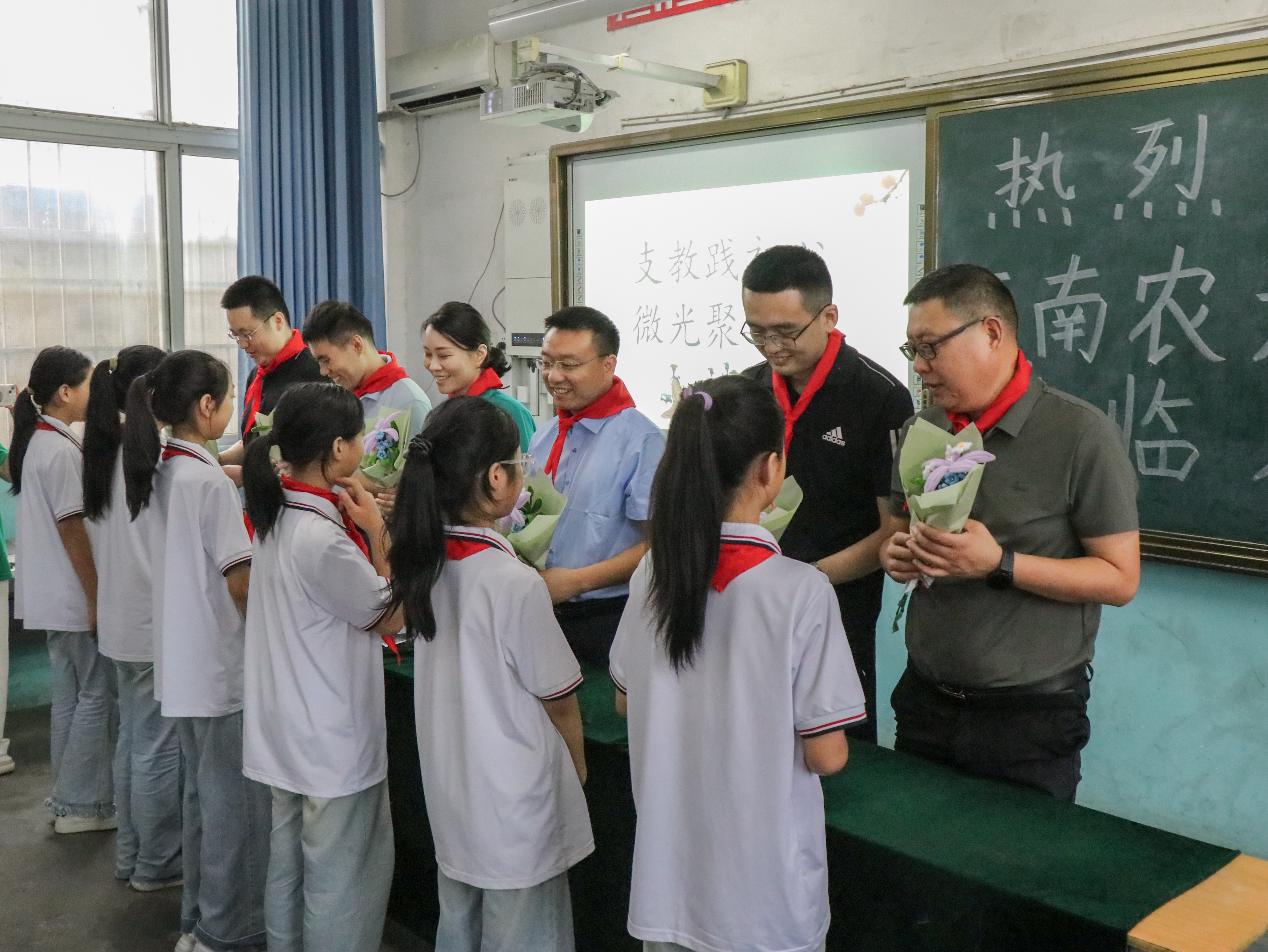 活动现场,学生们兴致勃勃,给老师们系上了代表敬爱之意的红领巾。韩城镇政府党委委员金博豪、韩城镇中心校长丁先锋、东关小学校长张幸峰对学院领导及支教团队一行人表示感谢,并将从多方面做好保障,于支教团队一道同心关爱,协力育才。