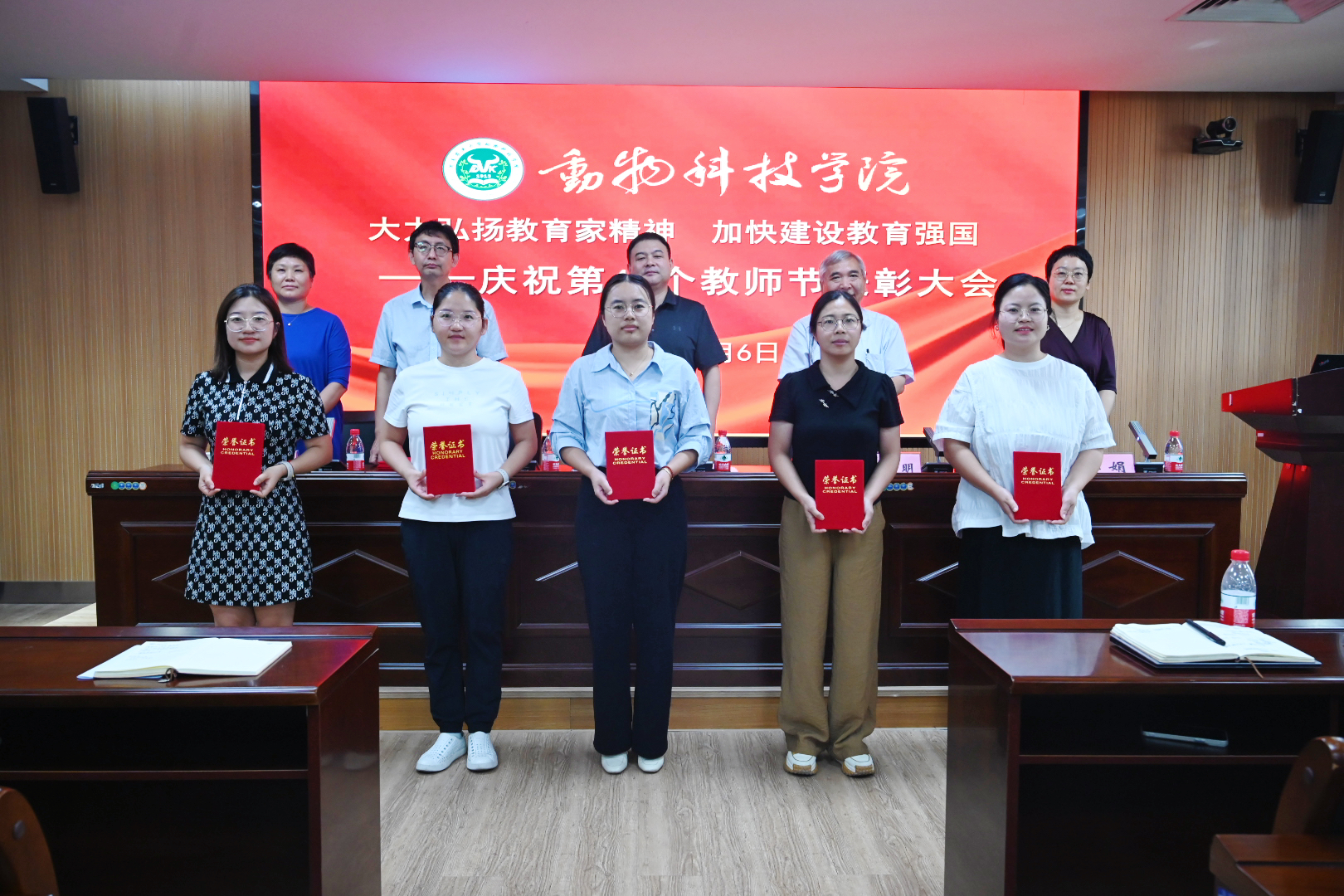农大牧原联合产业研究院执行院长兼学院副院长付彤宣读学院《关于表彰2024年度优秀教师、优秀教育工作者的决定》,副院长酒梅菊宣读学院《关于表彰2023-2024年度“三育人”先进个人的决定》和《关于表彰2023-2024学年优秀班主任的决定》。