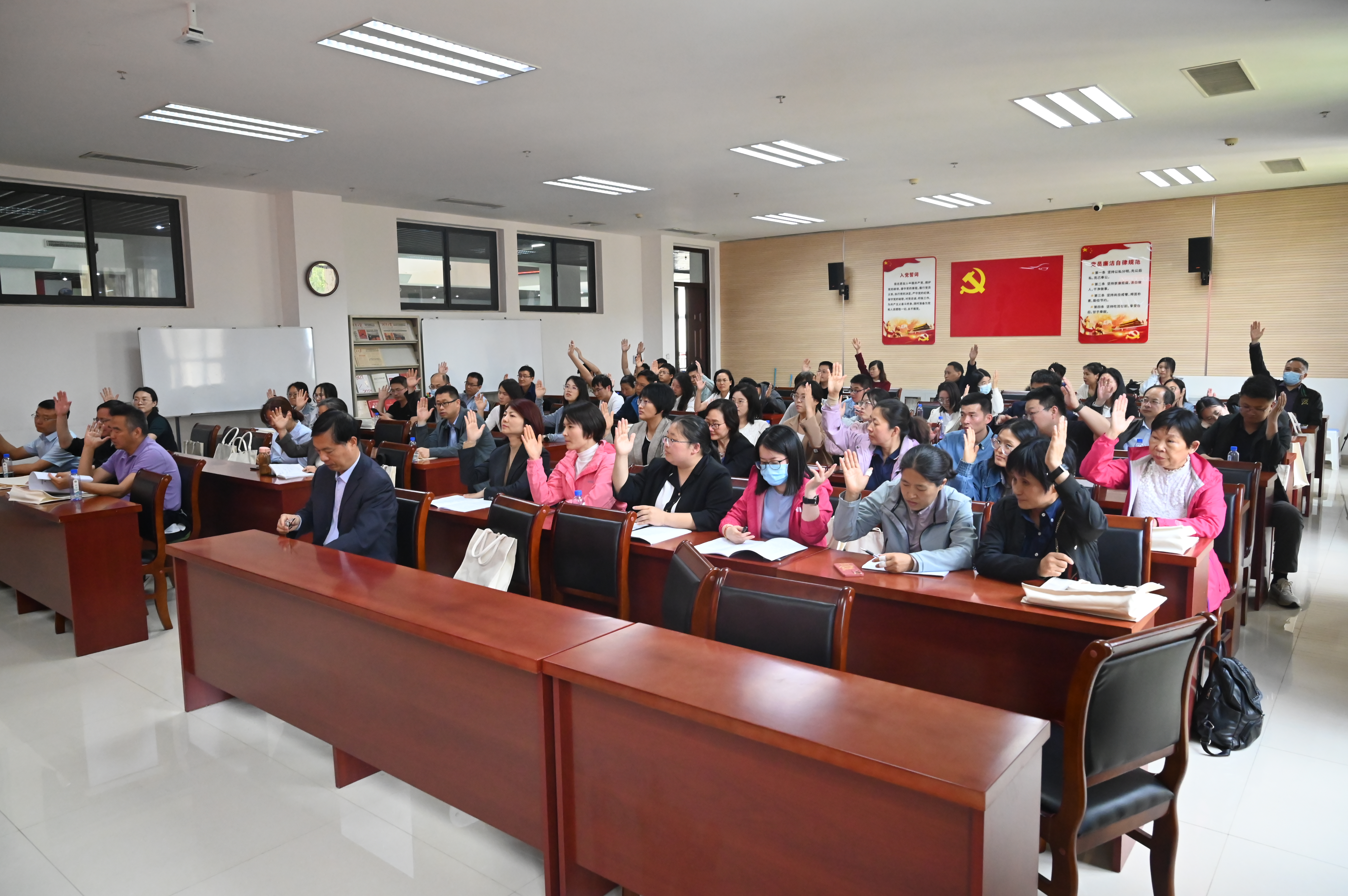 于龙子湖校区繁塔楼A324会议室召开一届六次教职工大会暨一届六次工会会员大会,院领导班子、全体教职工和特邀代表王成章教授参加会议。会议由院党委副书记、分工会主席郭娟主持。