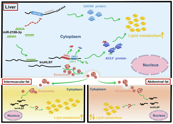 肝脏是鸡脂质代谢的主要器官,但有关鸡肝脏脂质代谢的调控机制,特别是长链非编码RNA(lncRNA)在这一过程中的作用机制依然不清。为此,课题组通过对产蛋前期和高峰期母鸡肝脏全长转录组分析,系统研究了鸡肝脏lncRNA与脂质代谢的关系,并鉴定出一个可促进肝细胞脂滴形成、甘油三酯和总胆固醇合成的基因间lncRNA lncHLEF。体外试验分析表明,lncHLEF不仅可以作为竞争性的内源性RNA调节miR-2188-3p/GATA6轴,还可编码3个功能小肽直接增强ACLY蛋白的稳定性,进而促进脂质合成。腺相关病毒介导的肝特异性lncHLEF过表达活体试验表明,lncHLEF可促进肝脏脂质合成,同时通过外泌体形式转运lncHLEF,从而促进肌内脂肪(IMF)沉积,但不改变腹部脂肪(AbF)沉积(图1)。该成果 “LncHLEF promotes hepatic lipid synthesis through the miR-2188-3p/GATA6 axis and encoding peptides, and enhances intramuscular fat deposition via exosomes” 以研究论文形式在线发表于国际著名期刊《International Journal of Biological Macromolecules》(中科院一区)。小黄书app