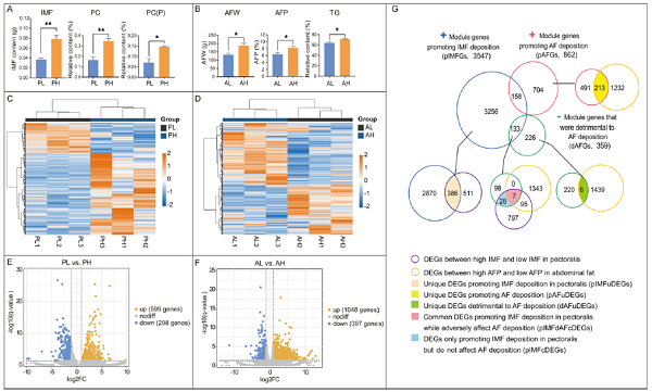 在鸡肉生产中,肌肉内脂肪(IMF)沉积有利于肉质的提升,而腹部脂肪(AbF)沉积却导致饲料浪费和环境污染。然而,IMF和AbF之间脂质组成的异质性和差异性沉积机制仍不清楚。课题组首先利用非靶向脂质组学技术,对地方鸡固始鸡胸肌IMF和AbF的组成成分进行了分析,共检测到423个鸡IMF和AbF之间的差异脂质分子(DLM),并确定了28种导致IMF和AbF异质沉积的主要DLM,通过加权基因共表达网络分析(WGCNA)将转录组与主要DLM进一步整合分析,发现了5个关键基因集,包括386个促进胸肌IMF沉积的特异性基因、213个促进AbF沉积的特异性基因、6个对AbF沉积不利的基因、7个促进胸肌肉IMF沉积但对AbF沉积有不利影响的基因以及28个仅促进胸肌IMF沉积但对AbF沉积没有影响的基因。这些发现为理解IMF和AbF差异性异沉积提供了新视角,并为通过育种选择提高肉质提供宝贵的信息资源(图4)。该成果 “Integrated LC/MS-based lipidomics and transcriptomics analyses revealed lipid composition heterogeneity between pectoralis intramuscular fat and abdominal fat and its regulatory mechanism in chicken” 以研究论文形式在线发表于国际著名期刊《Food Research International》(中科院一区)。小黄书app