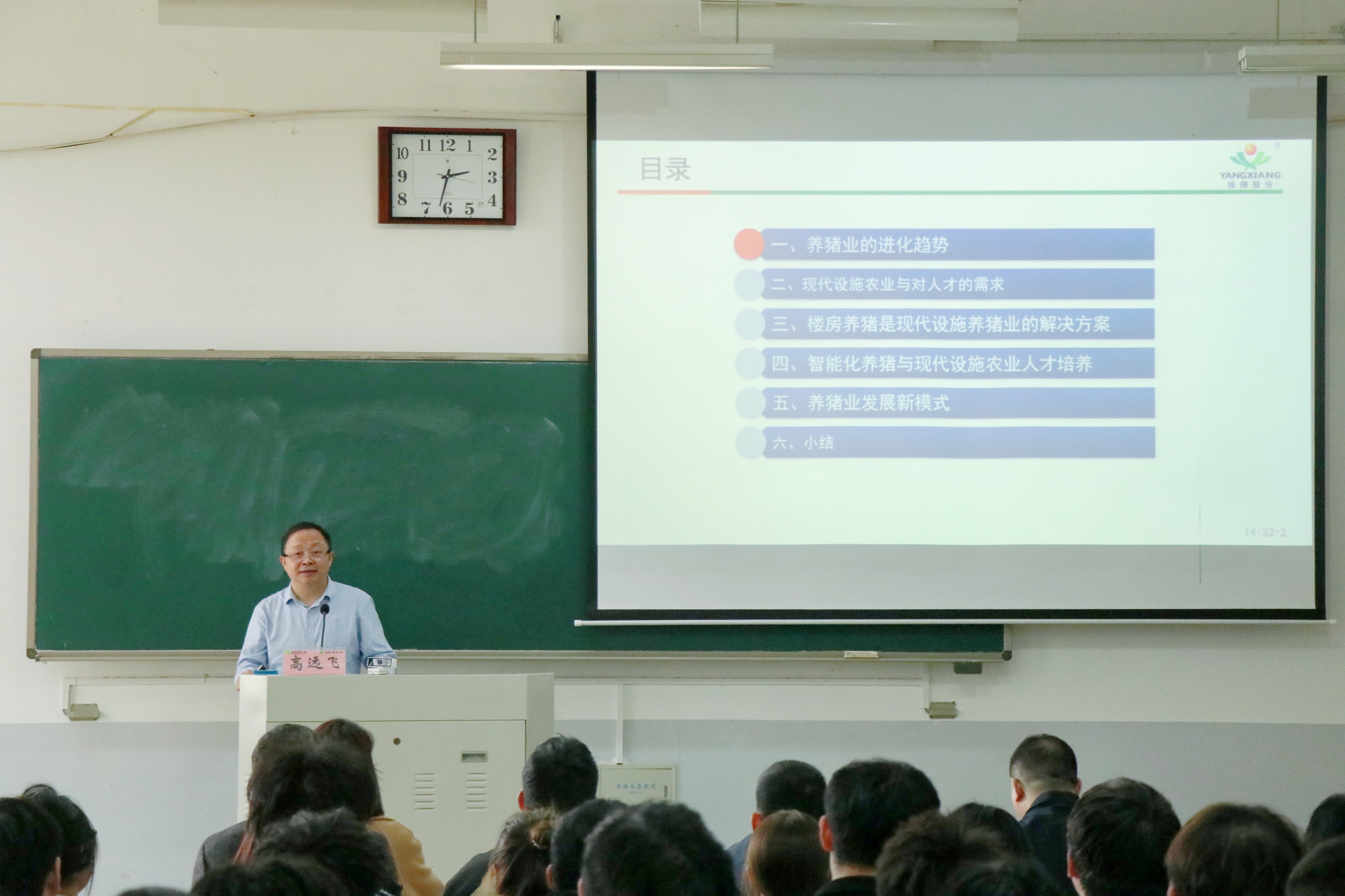 高远飞以《现代设施养猪业的发展与产业人才的培养》为主题,从个人对当前养猪业发展现状的思考分析为切入点,系统阐述了目前行业发展现状。随后,他结合公司实际讲述现代设施养猪业现状,重点讲解了楼房养猪的发展历程与关键技术,全景勾画出智慧牧业科学与工程专业在该行业的发展机遇。他详细介绍了未来猪场智能化解决方案与养猪发展新模式,鼓励大家把自身所学专业知识和想法贯穿到行业实践中去,为畜牧业发展贡献一份自己的力量。