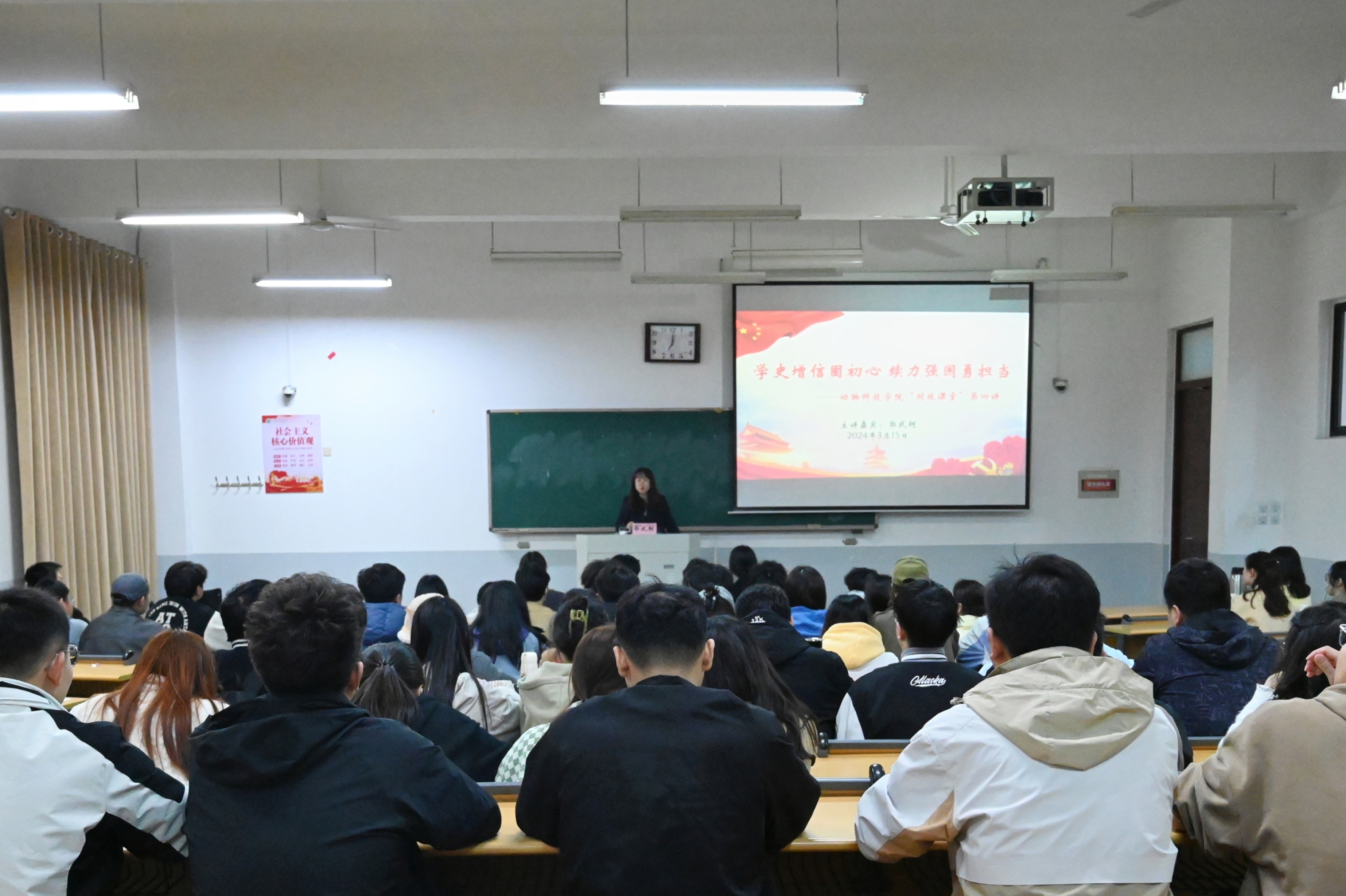 郭武轲以中华人民共和国新中国成立以来的时间脉络为主线,结合精彩事例和自身经历对我国从新中国成立以来取得众多世界性成就,在衣、食、住、行四个方面上的巨大改变进行详细介绍,引导学生们坚定民族自豪感,坚定在中国共产党的带领下全面建设社会主义现代化国家的信念。郭教授讲述深入浅出,生动活泼,学生反响热烈。