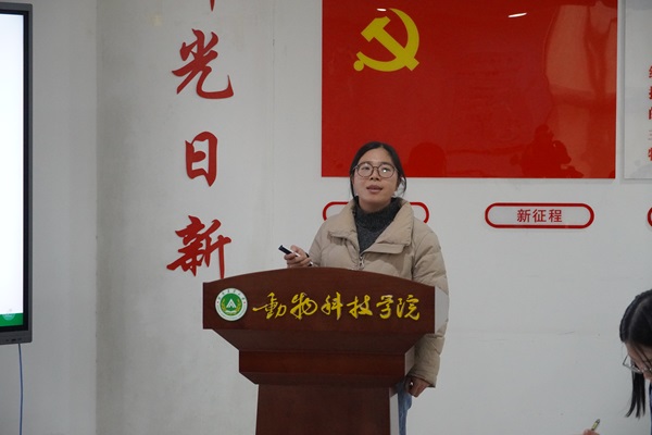 青年教师李新新、郭玉洁、刘凯珍、刘伯帅、余彤、黄小城分别以霉菌毒素生物解毒剂的研制与应用、地塞米松诱导雏鸡应激影响免疫关键调控基因鉴定及功能研究、营养调控在反刍动物绿色健康养殖中的作用、日粮营养-肠道菌群-动物健康、动物早期胚胎发育关键基因挖掘及其功能解析、脂肪酸(DHA)营养调控对草鱼脂肪组织和肝脏健康的影响为题进行专题汇报分享。