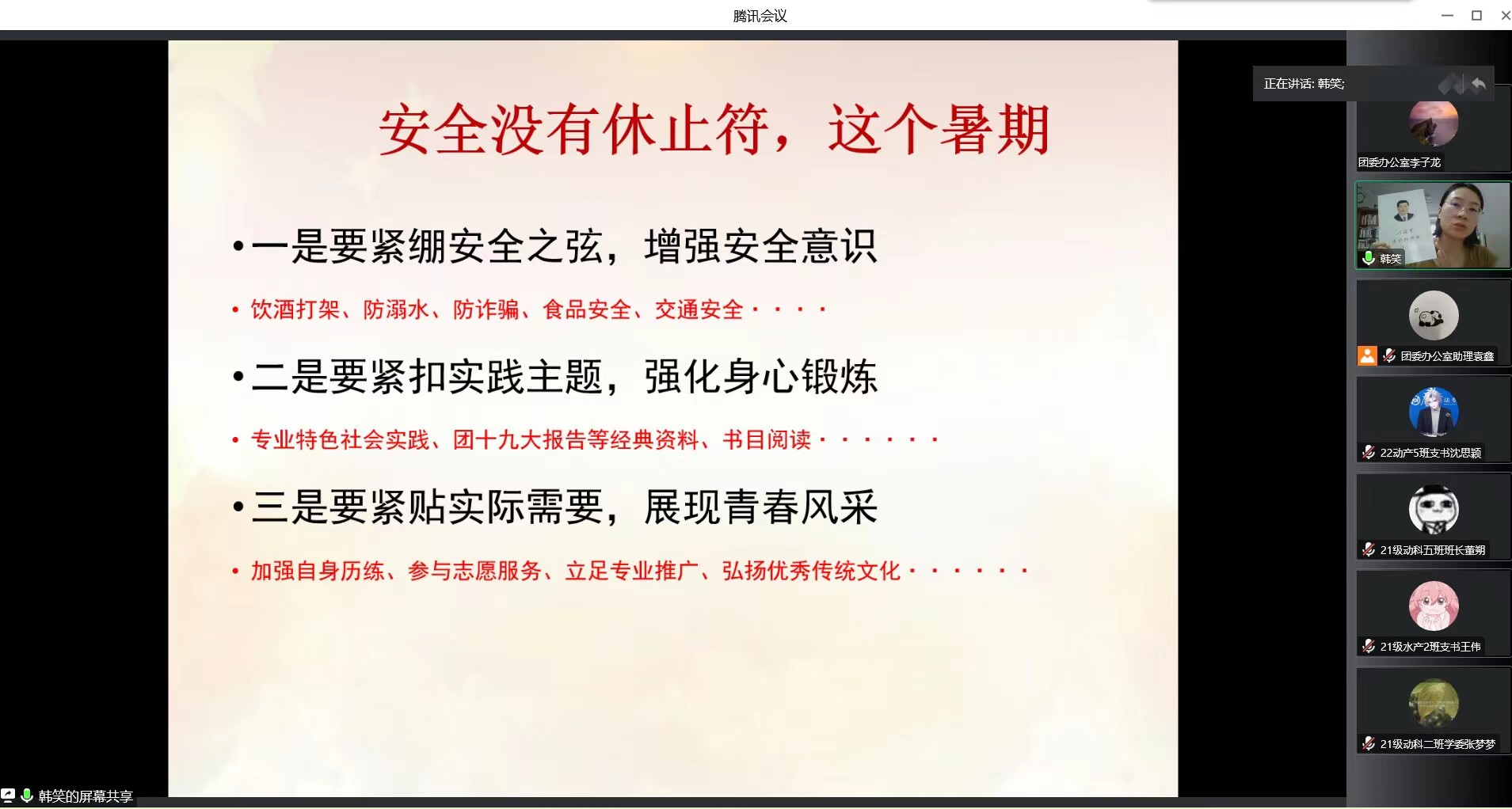 韩笑指出,安全没有休止符,假期安全教育,是学期末的最后一课和开启假期的第一课。叮嘱同学们严守法律法规、自觉抵制邪教,要紧绷安全之弦,增强安全意识;要紧扣实践主题,强化身心锻炼;同时,结合党的十九大精神学习等,紧贴实际需要,勇担使命,挺膺担当,以实际行动迎接中国共产党成立102周年,展现青春风采展现新时代好青年应有的精神风貌。