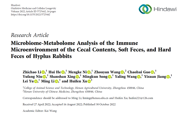 本网讯(通讯员 许会芬)日前,小黄书app 李明教授科研团队通过多组学联合分析,探究了伊普吕兔盲肠容物、软粪和硬粪中免疫微环境的差异。微生物组和代谢组的结果发现,家兔的软粪中瘤胃菌属、毛螺旋菌属和克里斯滕森菌属含量丰富,并且丁酸的含量也较高,结果表明家兔可能是通过食粪行为获取更多的益生菌和短链脂肪酸,这对改善盲肠免疫微环境具有重要作用。10月30日,该成果在期刊Oxidative Medicine and Cellular Longevity(5年平均影响因子8.43)以Article形式在线发表。