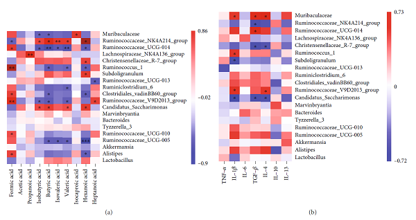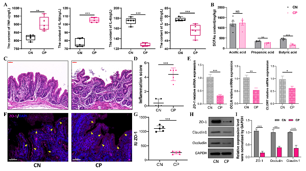 该研究分析了伊普吕兔兔盲肠内容物(Con组)、软粪(SF组)和硬粪(HF组)中的微生物群落的组成及细胞因子和短链脂肪酸(SCFAs)含量的差异,并且通过禁止食粪的方法验证了软粪对盲肠免疫微环境的影响。结果显示,Con组、SF组和HF组细胞门、属组成、细胞因子和SCFAs水平差异显著。细胞因子和SCFAs与不同菌群的相关性分析表明,Muribaculaceae、Ruminococcaceae_UCG-014、Ruminococcaceae_NK4A214_group和Christensenellaceae_R-7_Group与细胞因子和SCFAs密切相关。CP处理后盲肠丙酸、丁酸、IL-4、IL-10含量显著降低,TNF-α、IL-1β含量显著升高。此外,禁止食粪导致与肠道炎症和肠道屏障功能相关的紧密连接蛋白(Claudin-1、Occludin和ZO-1)表达水平下调,ZO-1的环状结构被破坏。综上所述,食粪行为不仅可以帮助家兔获得更多的益生菌和SCFAs,而且对改善盲肠免疫微环境具有重要作用。