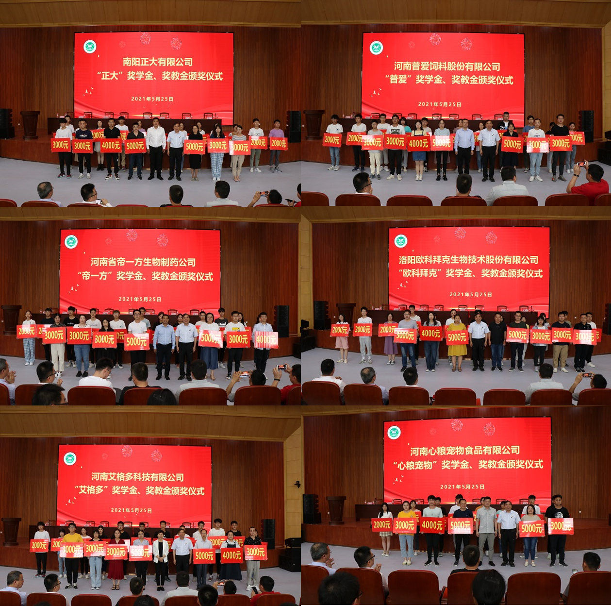 关于颁发2021年企业奖学金、奖教金的决定》,与会企业嘉宾分别为获得“正大”、“普爱”、“帝一方”、“欧科拜克”、“艾格多”、“心粮宠物”等六家企业奖学金、奖教金的108名师生颁奖。