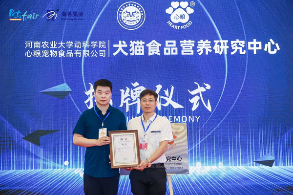 与心粮宠物食品合作共建的犬猫食品营养研究中心揭牌仪式在郑州国际会展中心举行。院党委书记贾磊、副院长付彤、心粮宠物食品董事长刘东豪、动物营养与饲料科学系主任陈文教授、心粮宠物食品技术总监罗建威等校企双方代表出席了揭牌仪式。