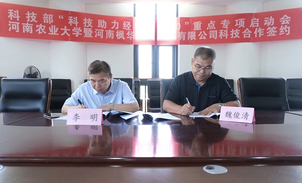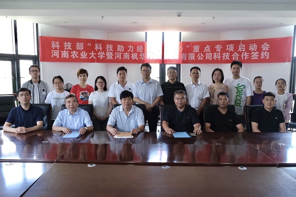 与河南枫华种业股份有限公司科技项目签约仪式。河南枫华种业股份有限公司总裁魏俊清、总经理李韦均,校科技处副处长田志强,院党委书记贾磊、院长李明出席仪式,养猪创新团队师生代表参加仪式。仪式由课题主持人、动物生产系党支部书记李新建主持。