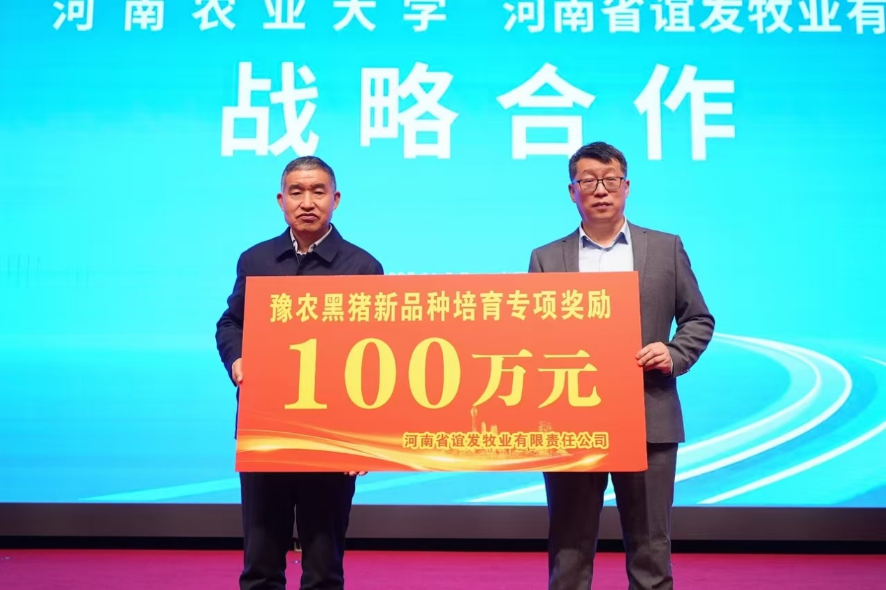 康相涛院士、副校长马菲,中原农谷管委会副主任杨海峰,省农业农村厅种业处处长王萌,鹤壁市农业农村局局长黄舒军,河南省谊发牧业有限公司董事长原泉水,学院院长田亚东,创新团队负责人李新建等多位领导、专家及企业代表的共同见证下,新品种顺利发布,现场同步举行了100万元“豫农黑猪新品种培育专项奖励”仪式,彰显对种业科技创新的重视。