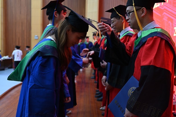在授予学位环节,学院领导及导师代表向毕业生授予硕士学位,拨正流苏,毕业生鞠躬致谢,合影留念,现场气氛热烈。