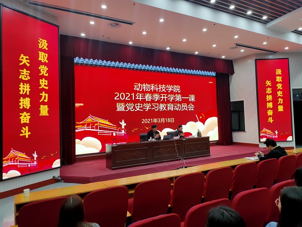 在龙子湖校区大教室一举行春季开学第一课暨党史学习教育动员大会,院党委书记贾磊做题为《汲取党史力量 矢志拼搏奋斗》的专题辅导报告。会议由院党委副书记郭娟主持,学院全体党员及入党积极分子参加大会。