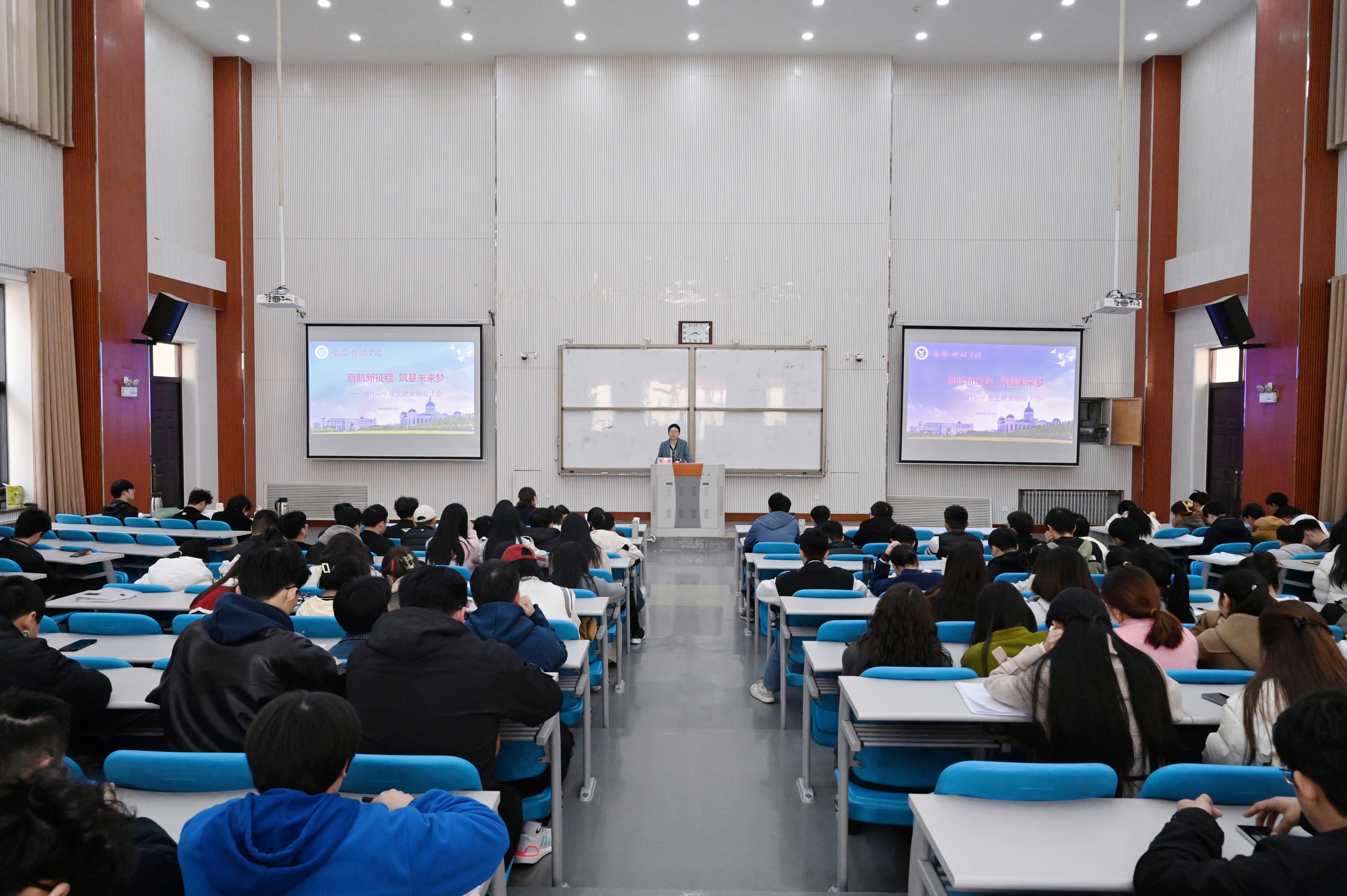 于龙子湖校区繁塔楼大教室四举办以“启航新征程,筑基未来梦”为主题的2024届毕业生就业创业大会,牧原产业联合研究院院长兼学院副院长付彤、院党委副书记郭娟、副院长孙宇、毕业生辅导员韩笑出席会议,2024届全体毕业生参加会议。