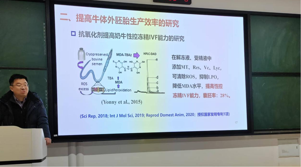 赵学明研究员以《牛高效繁殖技术研究进展》为题。首先,介绍了我国奶牛繁殖现状以及面临的问题与挑战。随后,赵学明研究员又详细阐述了奶牛繁殖力提升技术与治疗常见繁殖疾病的对策,最后又与同学们分享了牛体外胚胎生产和冷冻技术的研究进展,例如抗氧化剂提高奶牛性控冻精IVF能力的研究并亲切地与同学们探讨牛体外胚胎生产技术的意义和未来发展趋势。