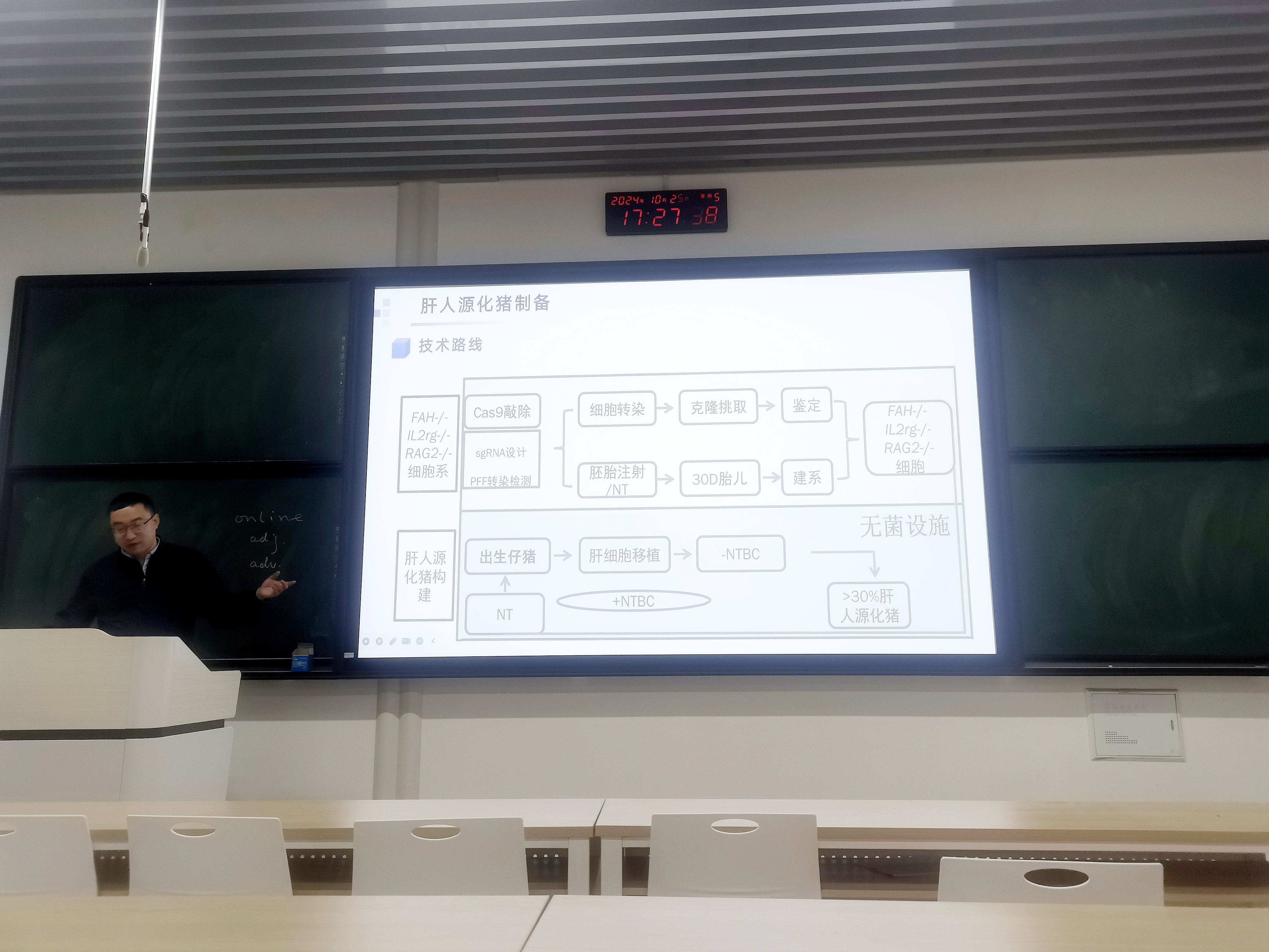 余大为研究员以诙谐幽默的授课风格,对畜禽资源的保存进行了细致的讲述。余大为研究员以我国畜禽种质资源保护利用不足,种业科技落后为背景,详细的解释了国家畜禽种质资源库建设的必要性和重要性,并详细介绍了家畜和野生濒危物种等种质资源保护的方法和策略。同时,余大为研究员深入介绍了动物克隆技术的应用,转基因与基因编辑在模式动物小鼠和大动物上的具体实施办法,并分享了肝人源化猪制备、生物反应器、疾病模型以及异种器官移植等前沿科学。该报告生动深刻,深入浅出,紧跟科研前沿,积极的带动了同学们的学习热情。
