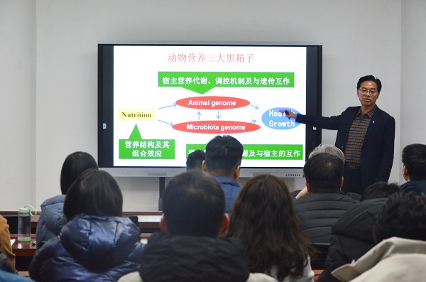 “日新论坛”(18期),动物营养与饲料科学学科王志祥教授、尹清强教授、陈文教授等相关学科教师及研究生参加了论坛,会议由院长李明教授主持。