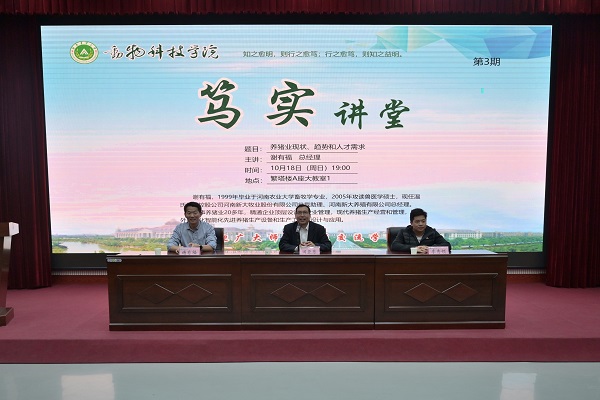 在教学楼大教室一举办第三期笃实讲堂,邀请温氏集团控股有限公司河南新大牧业股份有限公司总裁助理、河南新大养殖有限公司总经理谢有福为主讲嘉宾,副院长田亚东、辅导员李秀领老师、2020级全体新生和部分2019级学生参加活动,讲堂由田亚东主持。