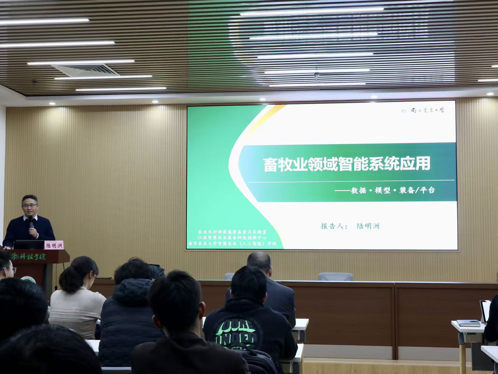 本网讯(通讯员 宫玉杰)2025年11月26日,小黄书app 在龙子湖校区第一实验楼南508会议室举办第 206 期“日新论坛”学术交流活动。本次活动特邀南京农业大学陆明洲教授作《畜牧业领域的智能系统》专题报告,会议由副院长孙宇主持,牧原联合产业研究院副院长蒋瑞瑞,学院相关教师、研究生、智慧牧业与工程专业本科生等师生参会,同时本次论坛也吸引了来自机电工程学院、经济与管理学院和林学院的相关师生。